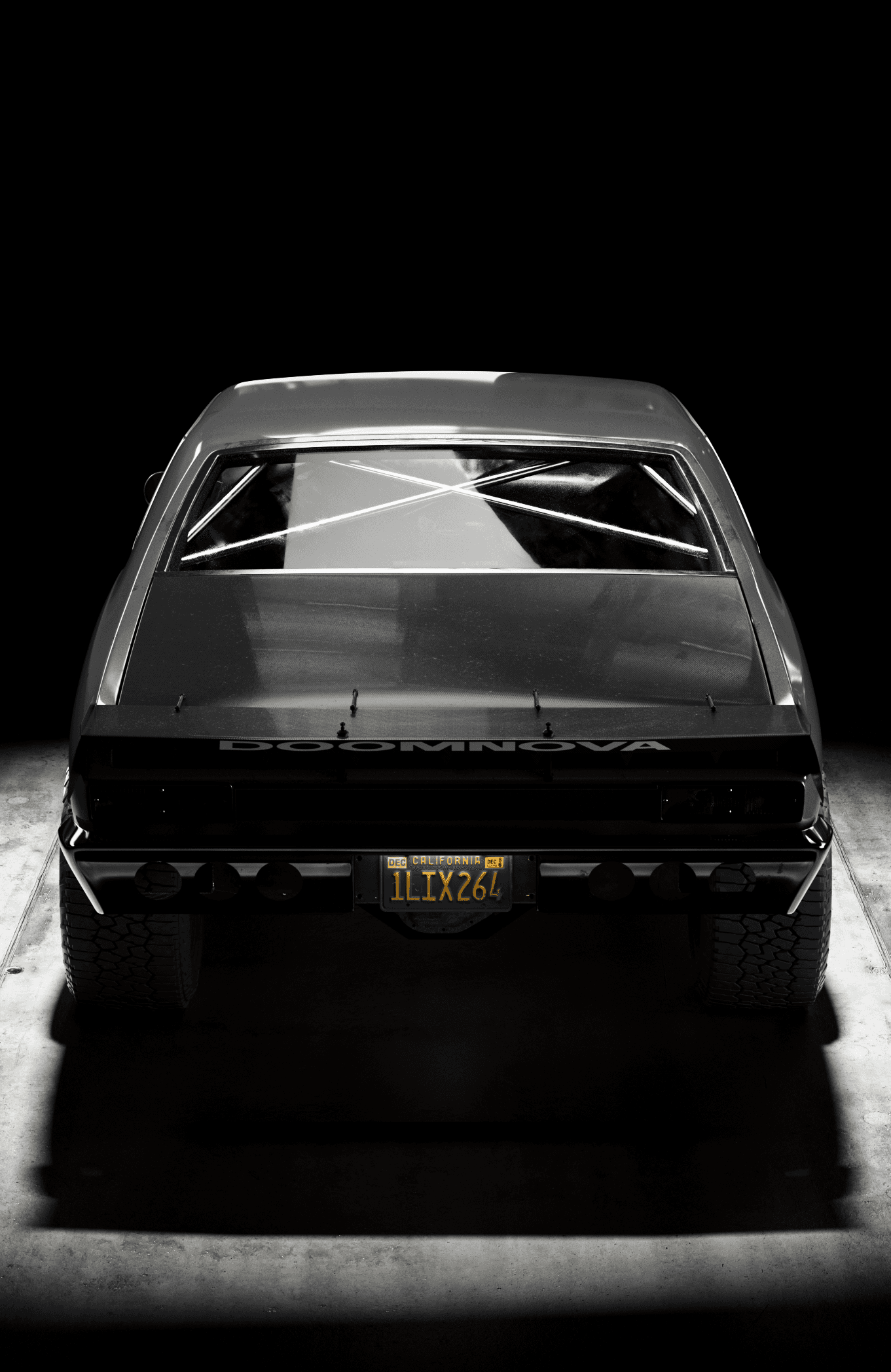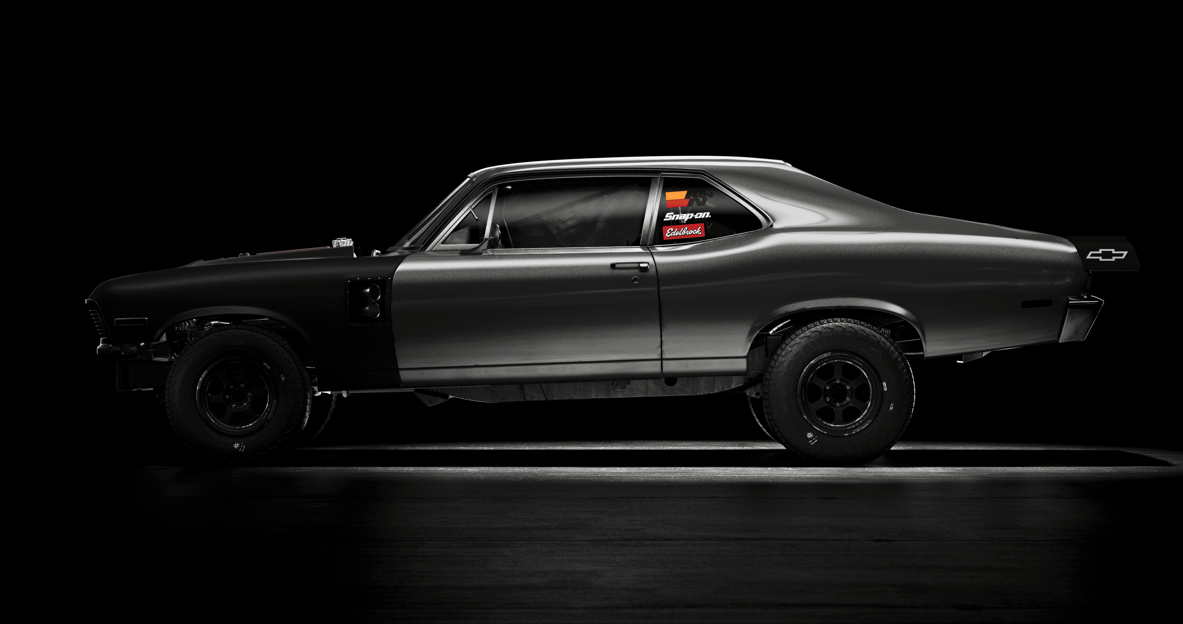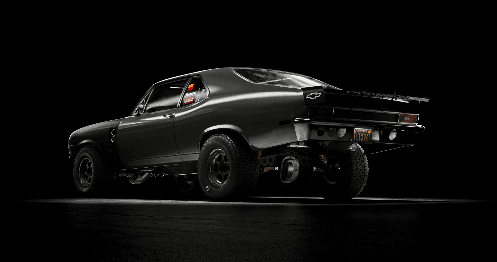 The Doomnova is a fantasy build, a Nova body pushed into something that sits between drag car, prerunner, and fever dream, so the visual language had to match that register without tipping into parody. The lighting approach was deliberately cinematic and low-key, keeping the matte black bodywork absorbed into the background while using tight rim sources to trace the musculature of the fenders and roofline. The rear three-quarter and straight-on rear frames were the most considered: the exposed suspension, the lightened bumper, and the roll cage X visible through the rear glass all needed to read as purposeful engineering rather than prop dressing, which required careful light placement to give depth to the undercarriage without flooding it. The overhead shot earns its place by revealing the blower stack cutting through the hood, the one moment of warm metallic colour in an otherwise near-monochromatic set, and the detail that confirms this is a working machine rather than a show car. The name stencilled across the rear spoiler was the final piece of world-building, treated with enough subtlety that it rewards attention rather than announces itself.