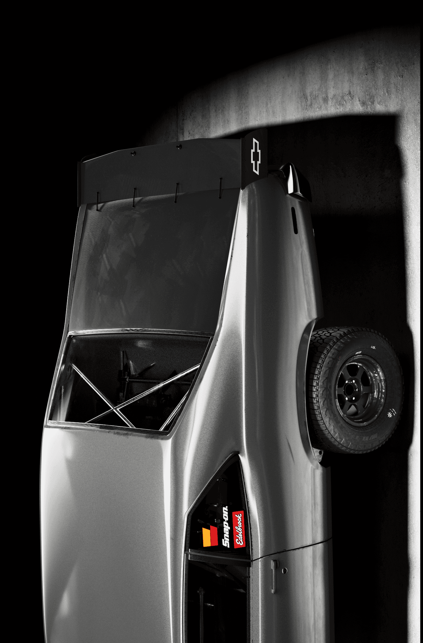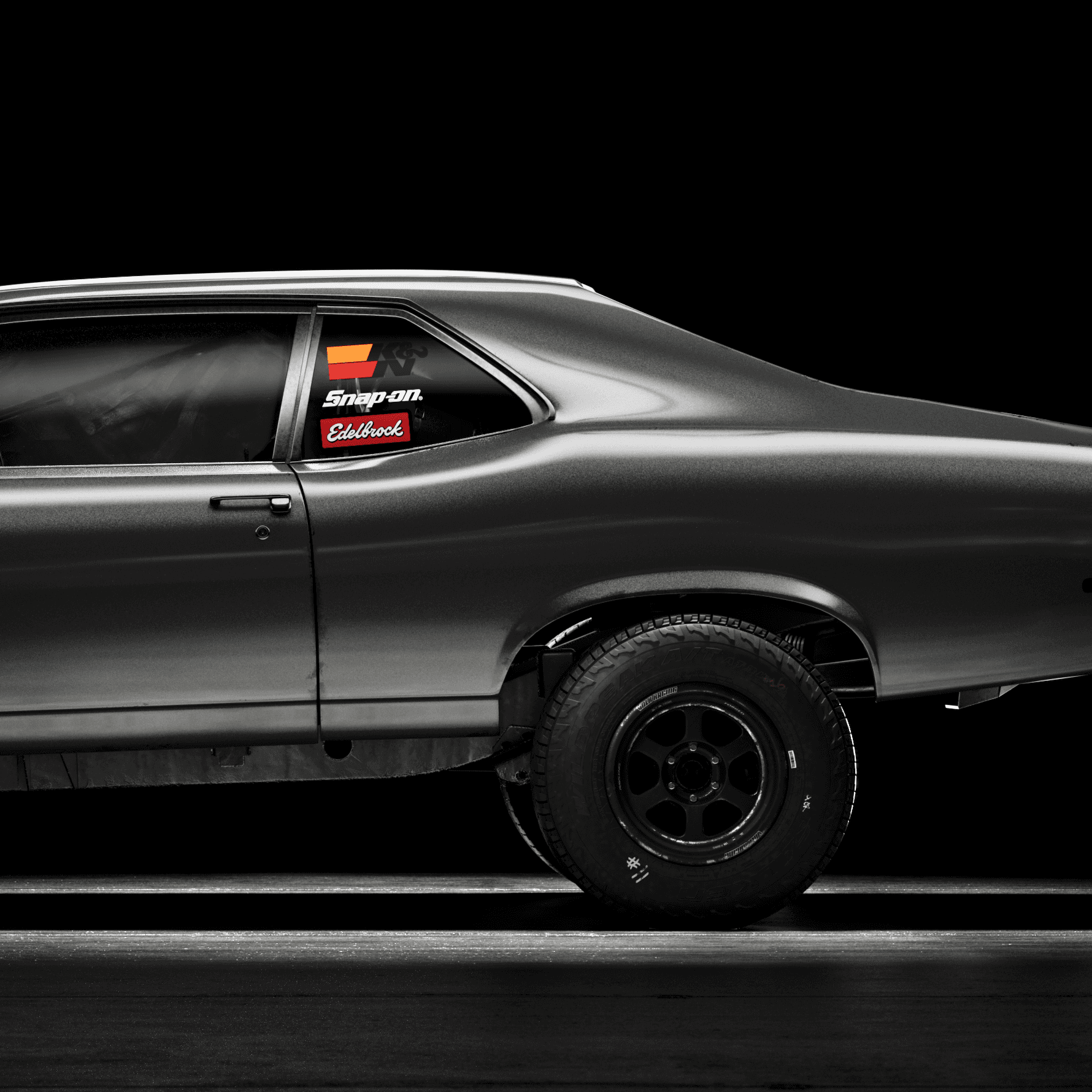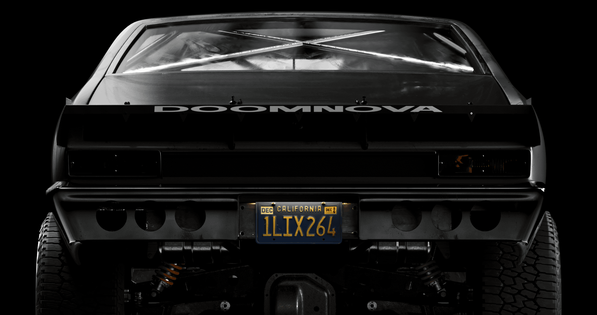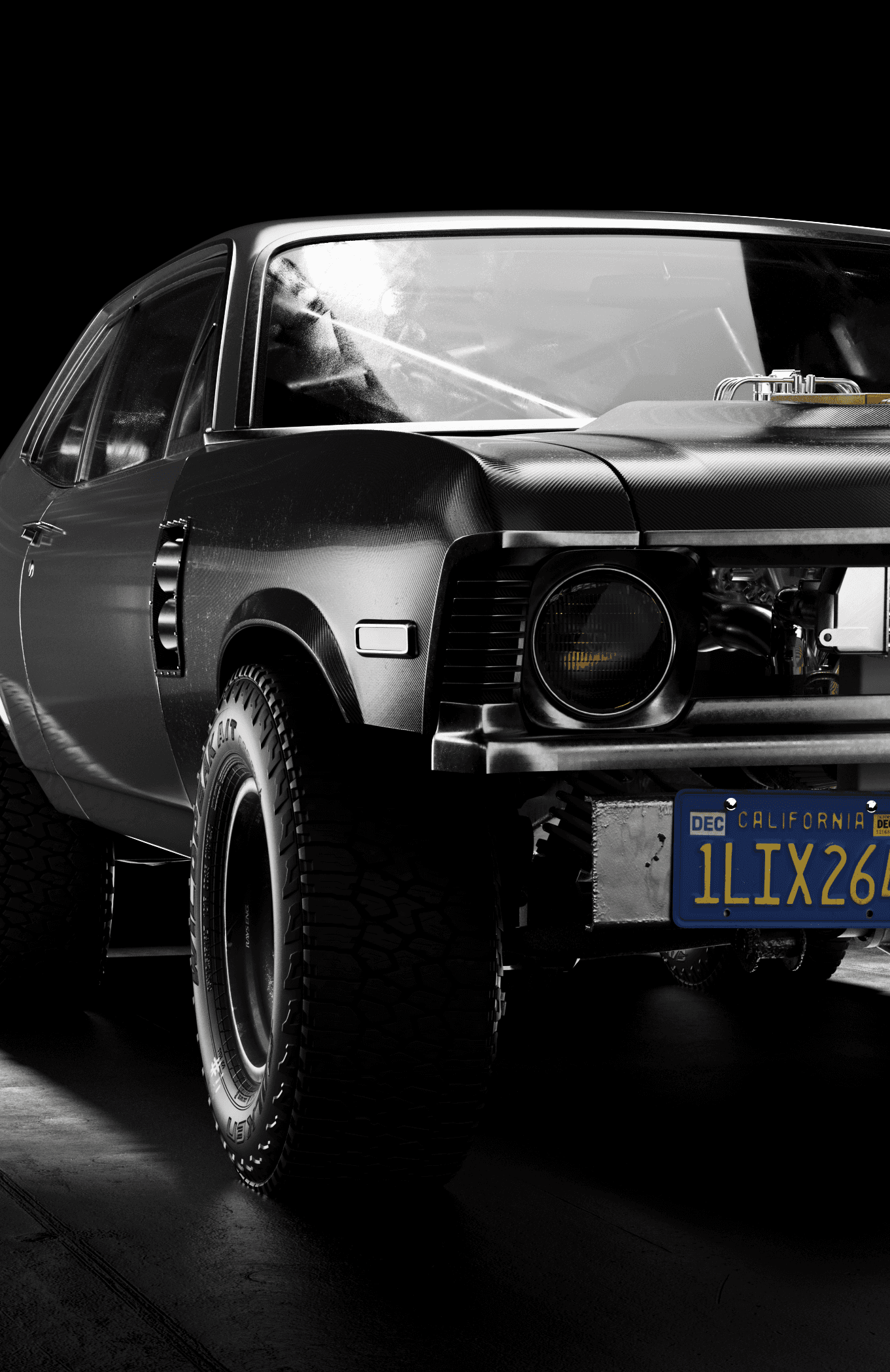 The Doomnova is a fantasy build, a Nova body pushed into something that sits between drag car, prerunner, and fever dream, so the visual language had to match that register without tipping into parody. The lighting approach was deliberately cinematic and low-key, keeping the matte black bodywork absorbed into the background while using tight rim sources to trace the musculature of the fenders and roofline. The rear three-quarter and straight-on rear frames were the most considered: the exposed suspension, the lightened bumper, and the roll cage X visible through the rear glass all needed to read as purposeful engineering rather than prop dressing, which required careful light placement to give depth to the undercarriage without flooding it. The overhead shot earns its place by revealing the blower stack cutting through the hood, the one moment of warm metallic colour in an otherwise near-monochromatic set, and the detail that confirms this is a working machine rather than a show car. The name stencilled across the rear spoiler was the final piece of world-building, treated with enough subtlety that it rewards attention rather than announces itself.