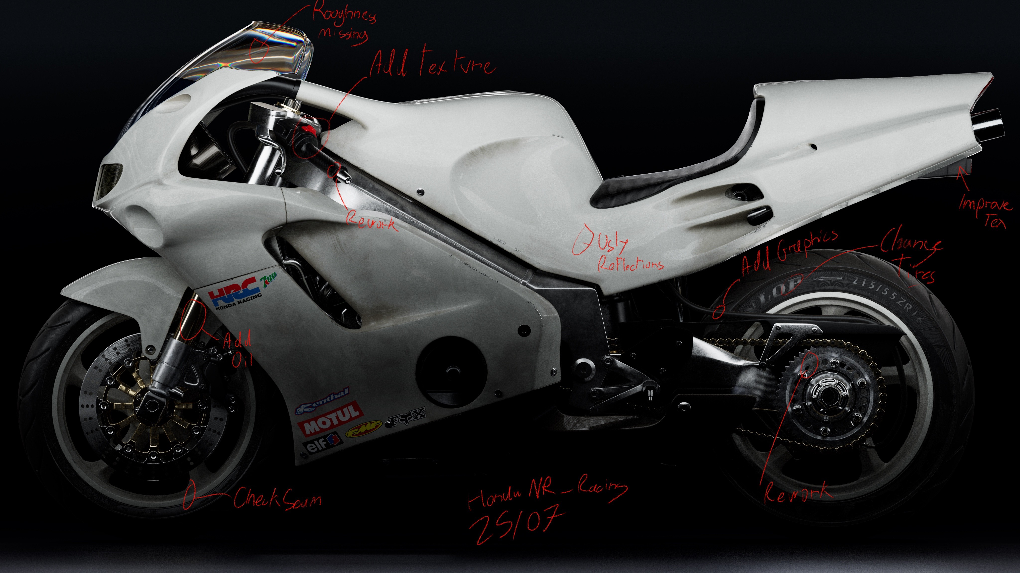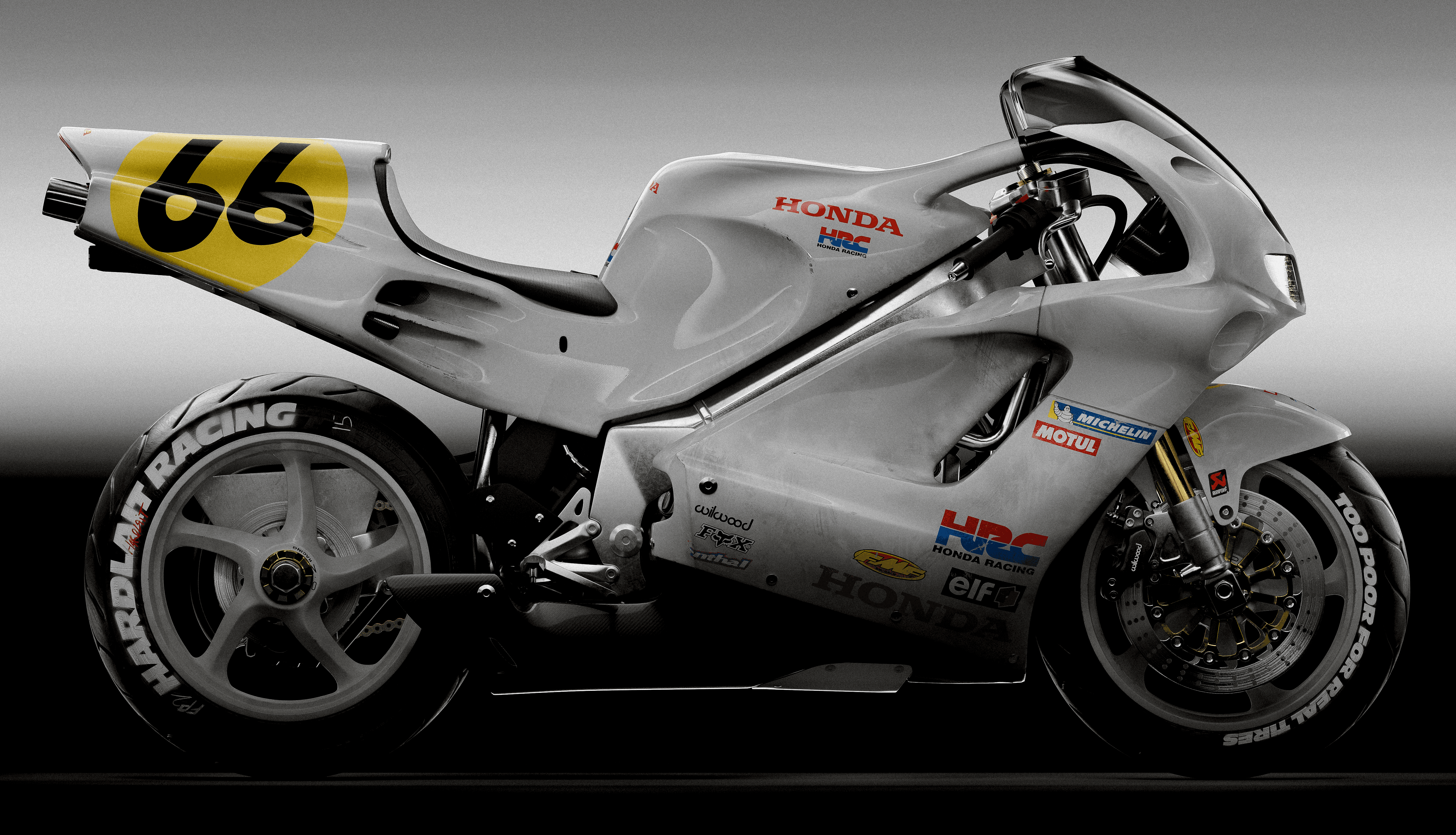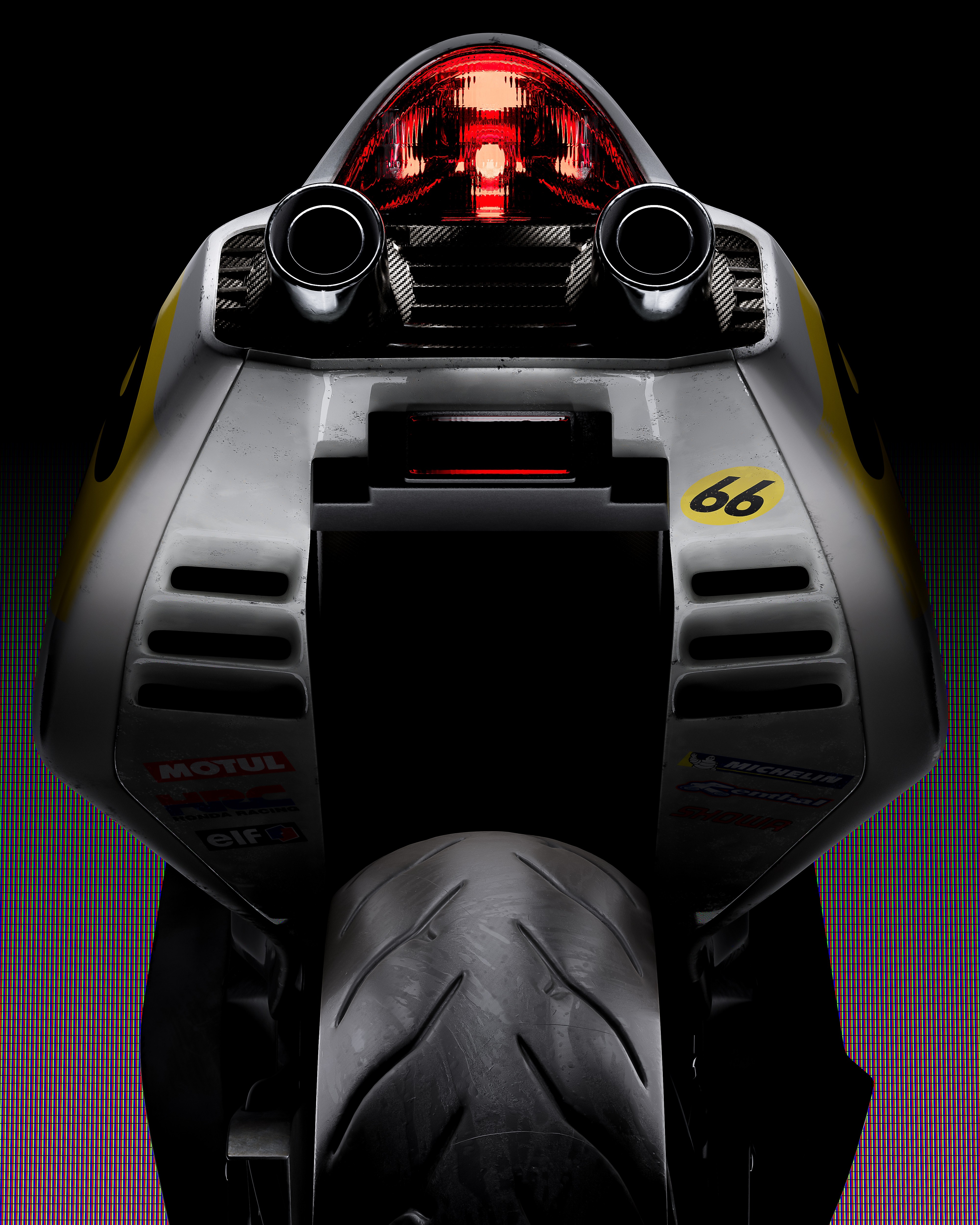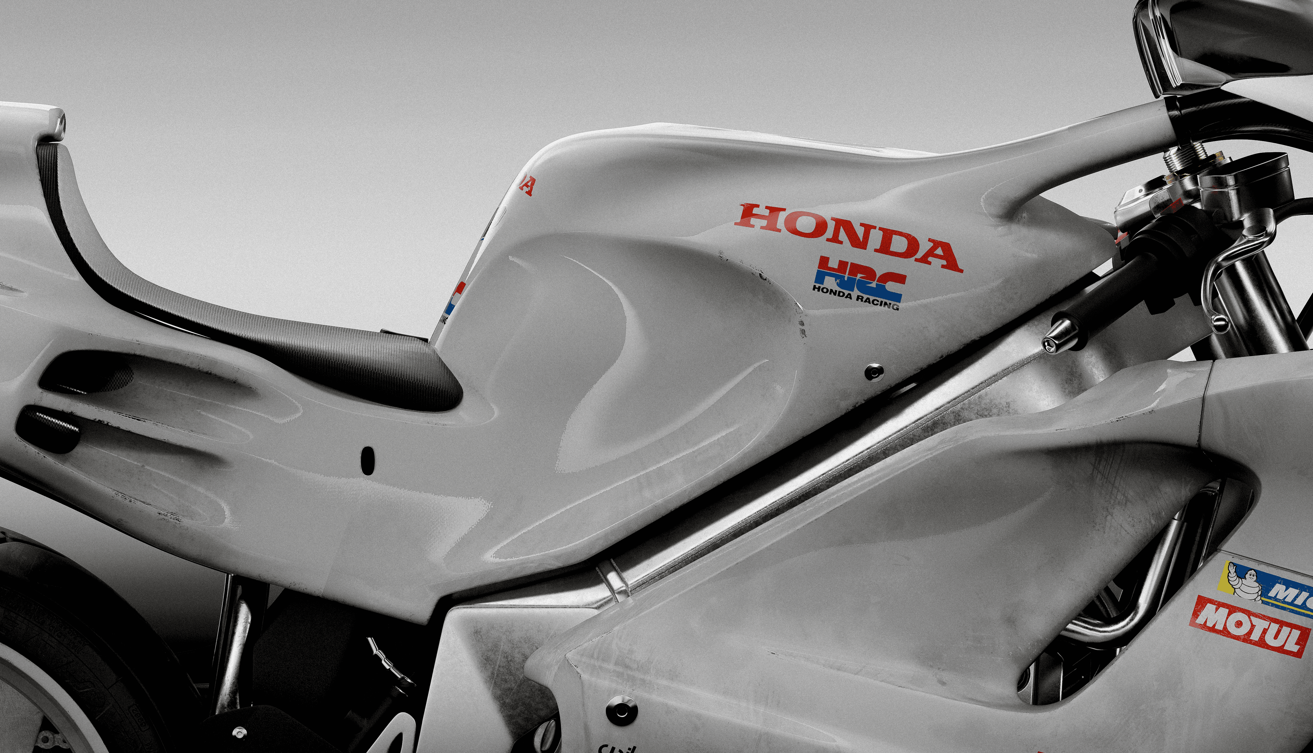 The NR was always a machine defined by obsession, oval pistons, engineering that had no business existing, so the creative decision was to honour that spirit rather than romanticise it. The grading leans desaturated and cool across the fairing, letting the fiberglass read almost like raw material, while the period-correct livery and wear keep it grounded in a specific historical register. The rear three-quarter is where the frame earns its tension: symmetry locked, tail light glowing red against black, exhaust cans flanking like punctuation marks. It's a composition about confrontation rather than beauty. The detail crop of the upper fairing, where the organic sculpting of the bodywork sits against the HRC badging, was a deliberate choice to surface the contradiction at the heart of the bike itself: something that looks handmade carrying the language of a racing programme. The CG allowed a level of lighting control that would be near-impossible on set, particularly in holding the matte quality of the bodywork without losing the metallic bite of the chassis beneath it.