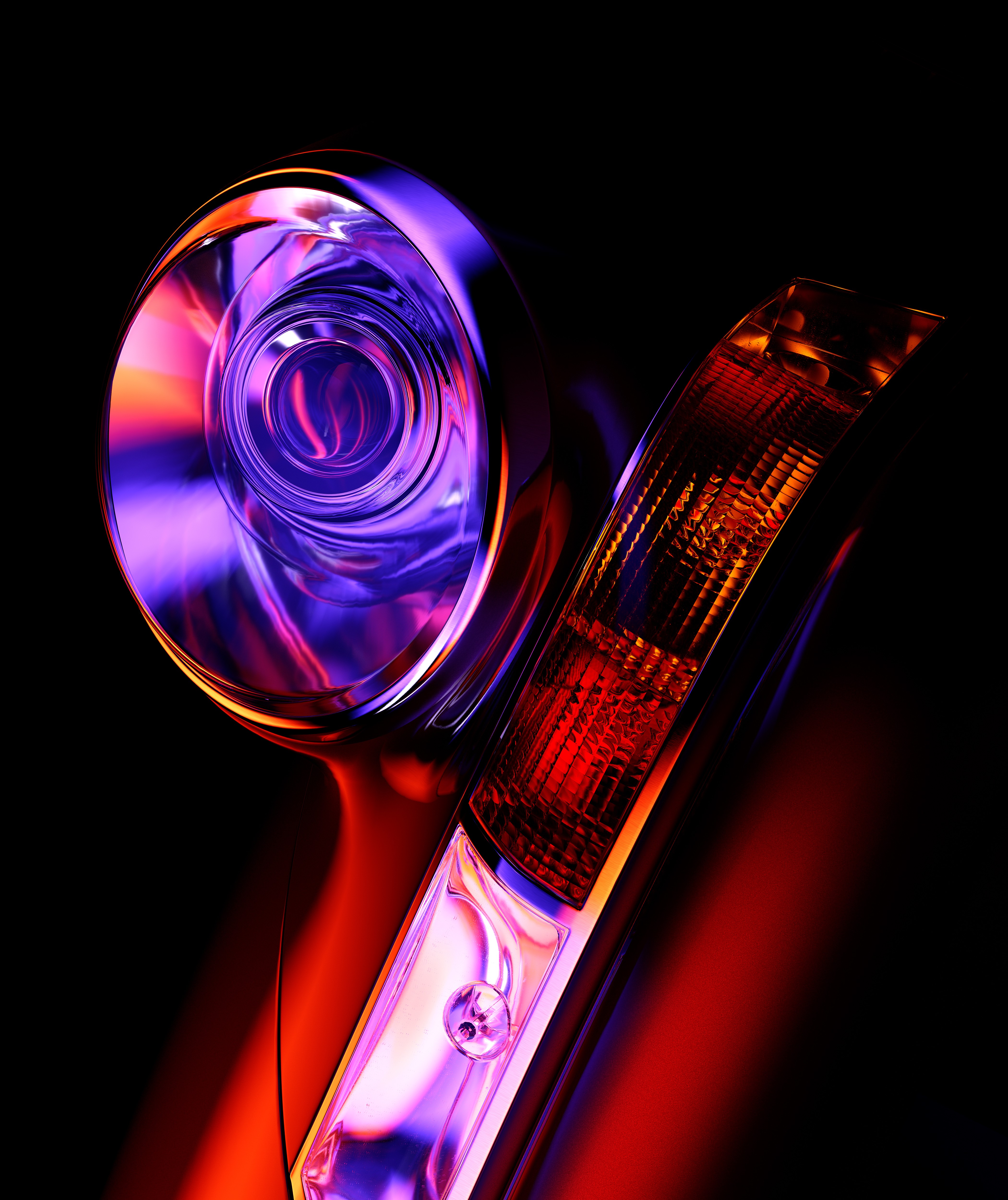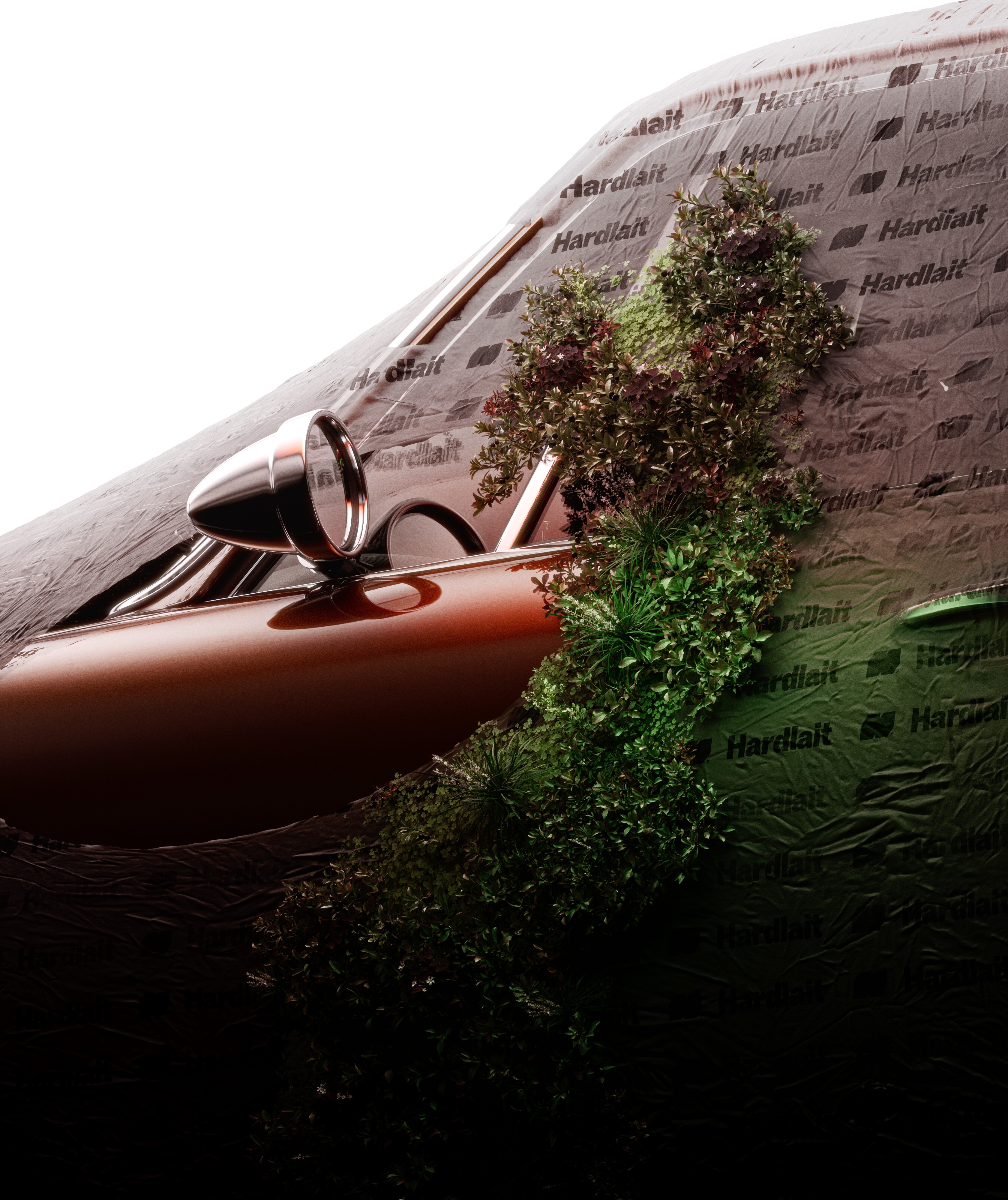 The direction here deliberately resists the conventions of automotive advertising. Rather than hero the car in the traditional sense, the concept wraps it, literally, in branded polythene and overgrowth, reframing it as an object preserved, hidden, or reclaimed. The tight crops and oblique angles fragment the body into abstract form, forcing the viewer to reconstruct the subject rather than simply consume it. The clean studio profile exists as the anchor, lighting split between deep shadow and sculpted copper metallic, but the more editorial frames are where the real creative tension lives.